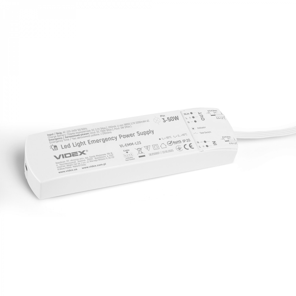The emergency power supply unit for LED luminaires VIDEX VL-EMM-L23 is designed to provide backup power to luminaires during a power outage. It operates with two embedded lithium-ion batteries with a capacity of 2200mAh each. It is used for lamps and luminaires with their own driver without galvanic isolation. In emergency mode (when the mains voltage disappears), it provides continuous power for lighting with a power of up to 3W for up to 3.5 hours.