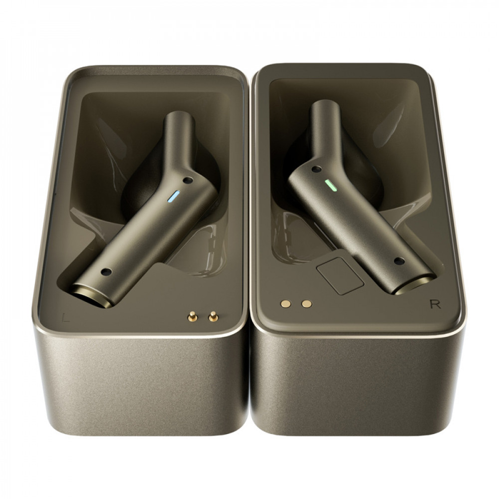 Gold-colored translation earbuds stored in a charging case