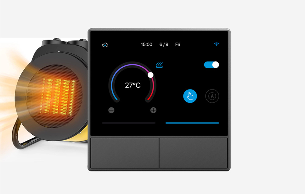 Experience how simple and convenient smart home management can be. Sonoff wall switch will be your own control center, with which you can operate your devices, select a specific scene and even check the weather. The device supports Wi-Fi connectivity and is compatible with the eWeLink app and the Amazon Alexa, Google Assistant, Siri and Alice assistants. It is also equipped with a user-friendly HMI panel, touchscreen, 2 physical switches, and a thermostat.