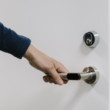 Standrata rokturis ar apaļu uzliku, kreisā puse (no ārpuses), Nerūsējošais tērauds (kvadrāts 8mm – durvju biezums 30mm līdz 56mm) – L forma | HAND-LEFT-SS-L