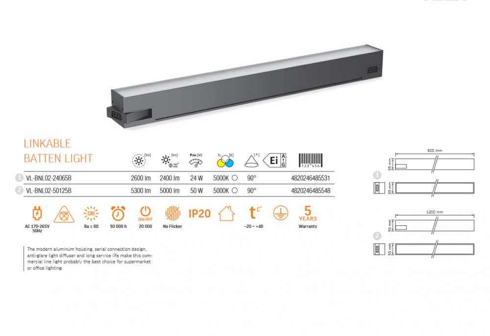 LED lineārā lampa VIDEX 24W, 600mm, 5000K - paredzēta telpu vispārējam apgaismojumam (biroju, veikalu, tirdzniecības zonu, noliktavu un ražošanas telpu u.c.). Paredzēts lietošanai tikai iekštelpās, jo lampai nav papildu aizsardzības pret putekļiem un mitrumu. Tam ir plašs darba temperatūras un sprieguma diapazons. Ietaupa darbības izmaksas, kas saistītas ar to, ka nav nepieciešams remontēt un nomainīt lampas vai sastāvdaļas. Ļauj savienot vairākas lampas nepārtrauktā līnijā vai ģeometriskā formā, lai realizētu dizaina ideju, apgaismojot telpu. Viegli uzstādāms un pieslēdzams. Savienošanai nepieciešams izmantot speciālu barošanas kabeli - VL-BNL02-F01B (nav iekļauts!, iegādājams atsevišķi, jo savienojot vairākas lampas vienu ar otru, ir jāizmanto tikai viens barošanas kabelis, lai lampas ķēde darbotos). Ievērot - lai ķēdē pieslēgto lampu kopējā slodze nepārsniedz 1000W!